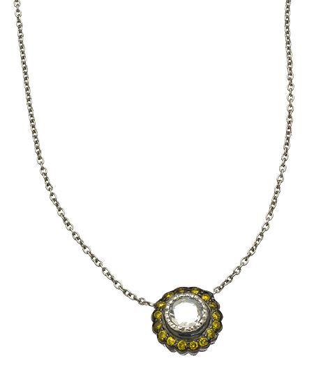 Sethi Couture reveals the meaning of true romance in this 18k white gold necklace, enhanced by a bright, rose cut diamond and encircled by tiny green diamonds.