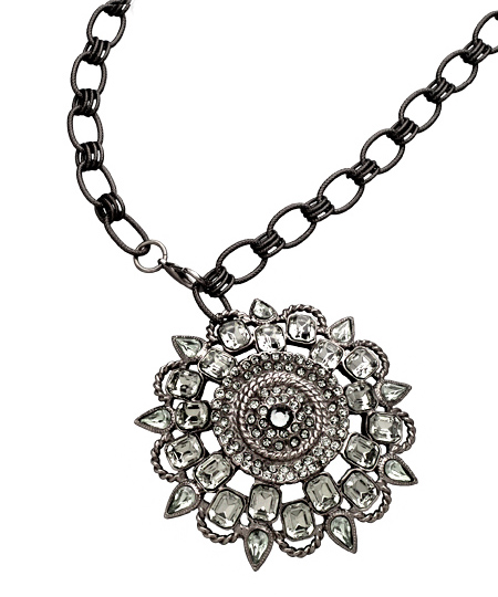 A statement is made by wearing this Shabana Khan Brin gunmetal pendant necklace. The grey Swarovski baguette and pear-shaped crystals sparkle and catch the light, as the round, grey crystal in the center unifies the sumptuous filigree pendant. A must-have for your jewel collection.