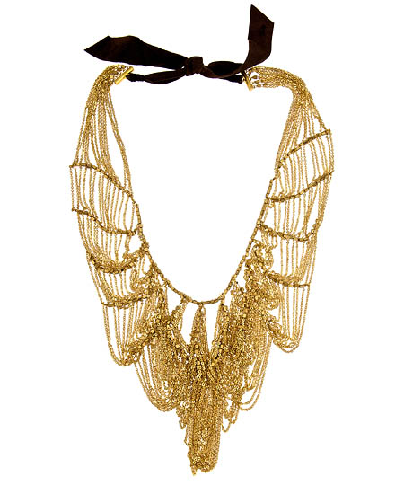 Shabana Khan's Meena necklace speaks of abundance without saying a word. Rivers of gold-toned chains are gracefully tiered and looped, flowing into a pool of opulence at the base of the design. It's an attention-grabbing look that announces your fearless, flawless style.