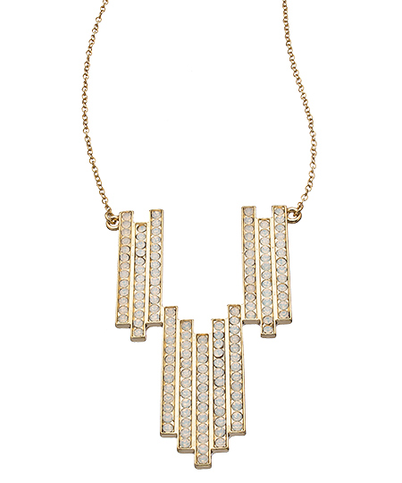 Shameless Jewelry brings you this gold and opalescent crystal art deco bib necklace, the one you'll wonder how you lived without! The shimmering Swarovski crystals are lined up for maximum sparkle, in this beautiful bib that sits between two lengths of gold chain. Necklace fastens with a lobster claw clasp.