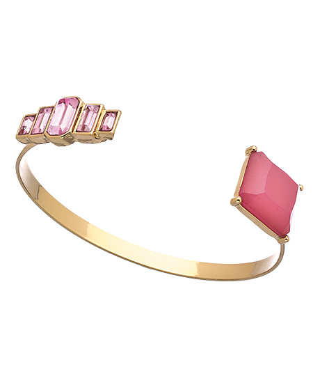 Pretty in pink... doesn't do this beautiful gold and pink art deco bracelet from Shameless Jewelry justice! A large cushion cut pink stone is joined by a row of graduated pink Swarovski crystals and set on a gold band, in this bracelet that is adjustable for the perfect fit.