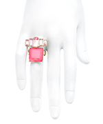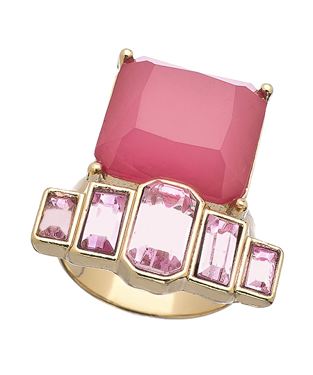 The large, pink cushion cut stone in this Shameless Jewelry gold and pink art deco ring is only the beginning! Adorning the top (or bottom is you prefer) is a row if graduated, emerald cut, pink Swarovski crystals. This regal ring will quickly become one of your all-time favorites. Ring is adjustable for the perfect fit.