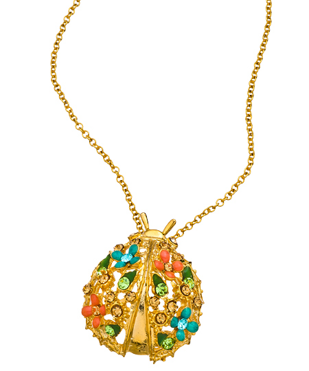 Who can resist this gold enamel ladybug necklace from Shameless Jewelry? The domed ladybug is lavishly adorned with green and gold Swarovski crystals and pink, green and turquoise enamel. Whether you wear it alone, or with the matching bracelet, this ladybug is the perfect pet!