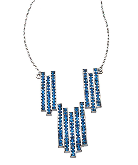 Gleaming silver and blue Swarovski crystals are paired to form this gorgeous Shameless Jewelry silver and blue crystal art deco bib necklace. The pendant joins two ends of the chain in this lovely necklace, which dresses your décolleté with unprecedented glamor. Necklace fastens with a lobster claw clasp.