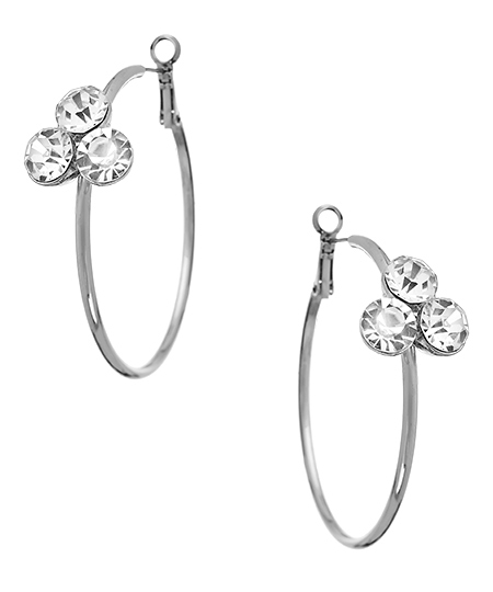 A group of three large, faceted Swarovski crystals is placed on a gleaming silver hoop, in these Shameless Jewelry silver and crystal trio hoop earrings. These expensive looking earrings are sure to bring many compliments your way! Earrings fasten with a lever back closure.