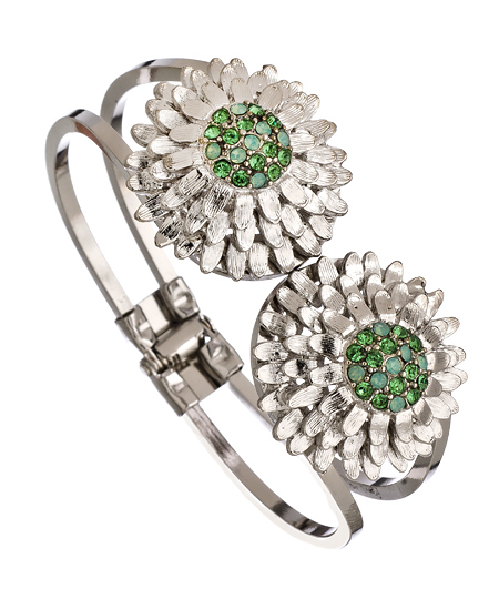 Classic elegance is in attendance with this silver and Swarovski crystal flower bracelet from Shameless Jewelry. Rhodium flowers, adorned with green and turquoise Swarovski crystals, sit atop a rhodium plated bounce-back bracelet