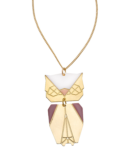 This Shlomit Ofir gold origami owl necklace is created with hues of peach, pink and mauve. Resting at the end of the beautiful long link chain, the whimsical Japanese origami inspired owl pendant is a perfect finishing touch for a myriad of wardrobe options. Necklace fastens with a toggle clasp.