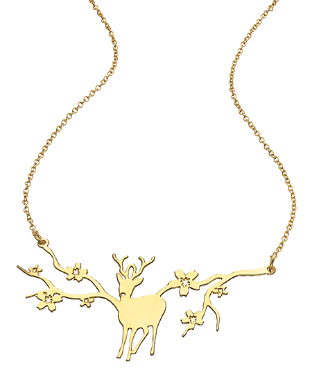 A forest scene, complete with an adorable deer surrounded by cherry blossoms, is the focal point of this Japanese inspired short gold Miyajima necklace from Shlomit Ofir. The short necklace will look beautiful over jewel tones, or your bare décolleté. Necklace fastens with a lobster claw clasp.