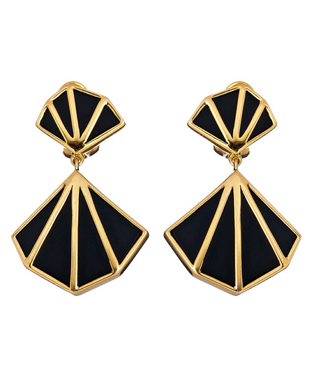 If it's fierce you want, you'll get it with these black onyx double shell earrings from Simone Wang. This ever so elegant pair of earrings boasts a unique yellow gold plated design over black onyx. Post and clamp closure for pierced ears.