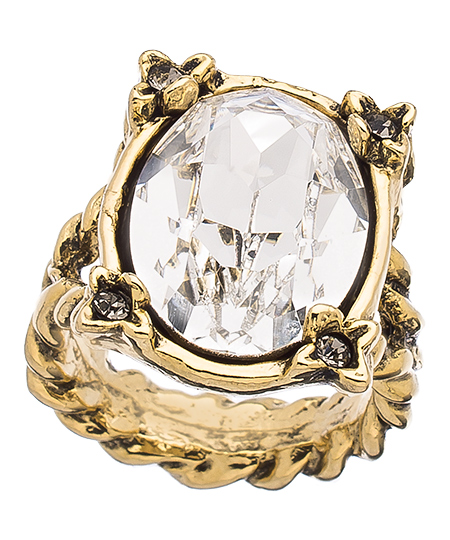 It's your time to sparkle and shine, and the silver shade vineyard ring from SKINNY by Jessica Elliot lets you do well! A large Swarovksi crystal, in vintage gold settings, shines boldly on a double twisted band. This statement-making cocktail ring tells the world you're a swank dame with confident taste.