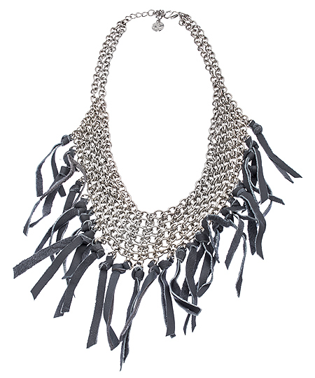 Equal parts rock 'n' roll and tribal princess, this jawdropping boho grey leather fringe necklace from SKINNY by Jessica Elliot is for the one who wants to make a statement. A bib-like necklace with multiple strands of silver chains, showcase cool leather fringes for an edgy appeal. It totally transforms any look you pair it with.