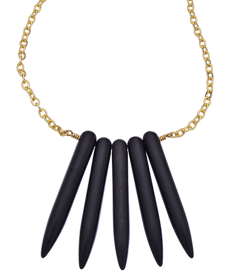 The rich contrast of color and texture in this SKINNY by Jessica Elliot gold and black spikes necklace are only two of the features of this remarkable piece of jewelry. The lovely gold chain is perfectly suited to accompany the five matte black spikes. This necklace also features a Jessica Elliot logo tag and a lobster clasp closure.