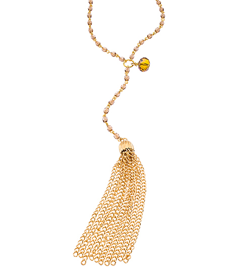 This beautiful smoky quartz rosary tassel necklace from SKINNY by Jessica Elliot is vintage elegance at its best. A long gold chain is draped with a series of sparkling smoky quartz beads that lead into a long gold chain tassel. You can save this beauty for a special occasion or wear it with casual looks just to show off!