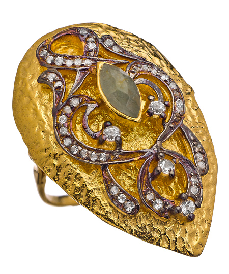 Say hello to one of your new favorite pieces of jewelry; the crystal teardrop cocktail ring from SKU. The ring features a simple band which is accented with a teardrop shaped ring top in a hammered texture. In addition you'll notice the gunmetal swirls covered in radiant crystals.