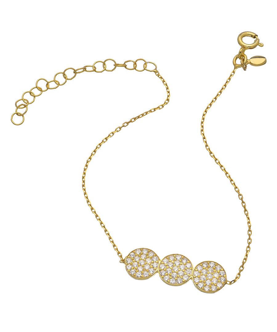 Simple, sparkling circles make this SKU Jewelry CZ tri-circle bracelet something special.Your unique sensibilities will appreciate this handsome piece that showcases a trio of discs adorned with CZ stones in such a beautiful way. Available in your choice of rhodium plated 925 sterling silver, gold plated over sterling silver or rose gold plated over sterling silver, the bracelet fastens with a spring clasp and features a generous extender. Please specify metal choice when ordering.