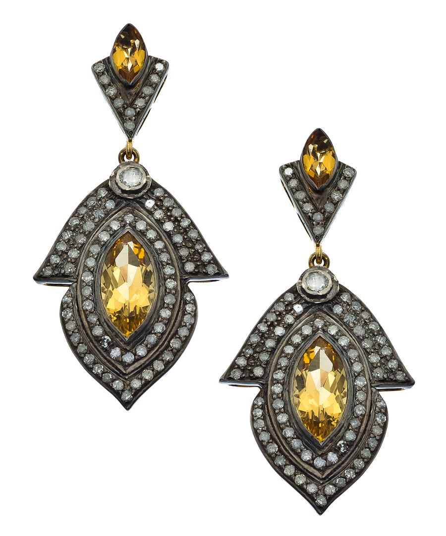 The spirit of Art Deco is given shape with these Socheec gold, silver, diamond and citrine drop earrings. From the curving lines and sharp angles, to the timeless luminosity of the citrine and diamond stones, these lovelies are ready to accessorize your favorite looks. Earrings fasten with a post closure for pierced ears.