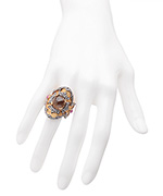 No detail has been overlooked in this gold, silver, garnet and quartz imperial cocktail ring from Socheec. A hammered gold background set s the stage for the silver design, itself lined with dazzling diamonds. A large, faceted, smoky quartz sits in the center, accented by bright garnet stones on either side.