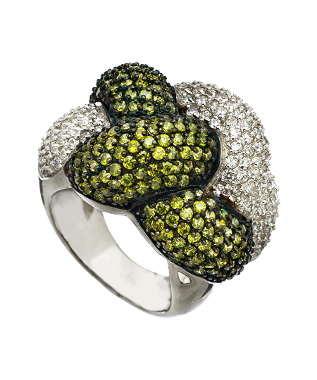 This micro pave, green and clear CZ and silver knot cocktail ring from Somchintana is so exquisite, you'll find yourself wearing it with everything. Rich, sparkling green and clear crystal micro pave forms the luxurious knot. And, while micro pave is a very labor intensive process, its authentic look is well worth the investment.