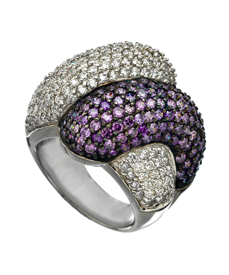 The startling contrast of Somchintana's micro pave purple and white CZ and silver loop cocktail ring sets the tone for elegance. Beautiful fields of micro pave purple and white crystals appear to loop around one another, for a look that is stunning, luxurious and totally you!