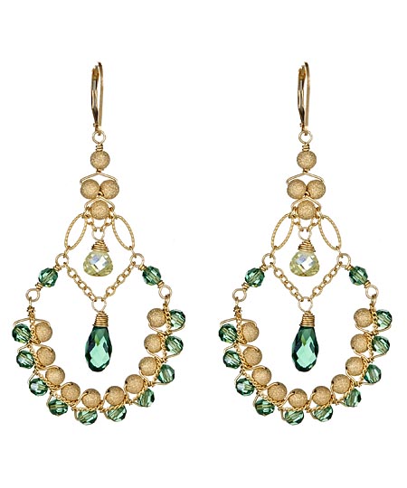 Sophia & Chloe divine erenite and stardust earrings are amazing. Luminous erenite Swarovski crystals and shimmering gold filled stardust beads are wrapped with stunning gold filled chains to form these breathtaking teardrop-shaped earrings. Hanging 3 inches long from your ears, each earring also features dangling erenite and lime Swarovski crystals that sparkle at the center. Lever backs for pierced ears.