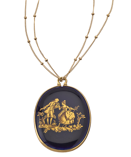 Deep, hypnotic, cobalt blue provides the backdrop for the couple cameo, in this Sophia & Chloe gold and Limoges porcelain couple cameo Anne necklace. Limoges porcelain is brilliantly utilized in the antique, signed Limoges cameo pendant, which is set in a gold bezel.
