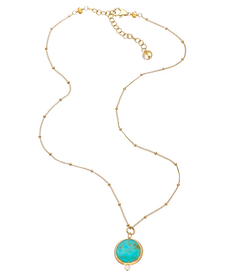 For a bit of understated elegance, try the harmony drop necklace from Sophia and Chloe. The single strand dotted gold filled chain is ornamented by a turquoise bezel set stone pendant. It is also accented with an ivory pearl on the bottom. This chain fastens with a lobster claw closure.
