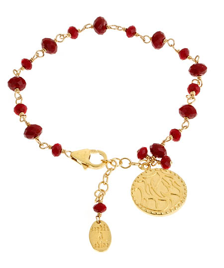 Bring your message everywhere you go when you don this Tikkun Olam bracelet by Sophia and Chloe. The Tikkun Olam bracelet symbolizes that statement “Repair the World” in Hebrew. A bevy of ruby quartz stones are strewn across the 14k gold bracelet.