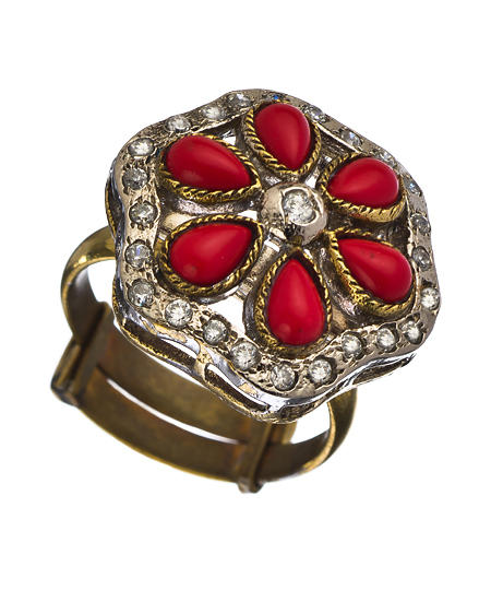 This Taara gold, coral and crystal cocktail ring is the one you've been waiting for! Six teardrop coral stones surround a large clear crystal and are framed by a dozens of smaller sparkling crystals. Cocktails, anyone? Ring is adjustable for the perfect fit.