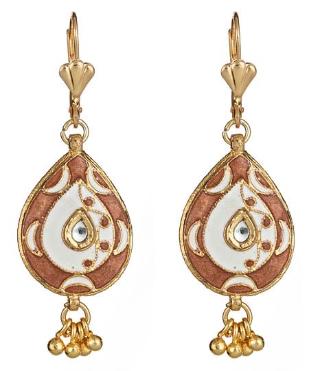 The Taara paisley drop earrings have an easy elegance to them that is perfect for both special occasions and everyday wear. The gorgeous enamelwork features a glowing combination of pink with white crescent moons that shines against polished 22k yellow gold. Four tiny goldtone beads dangle from the bottom of the large teardrop. The lever backs are for pierced ears.