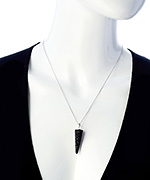 Tang & Song scores a win with this sterling silver and black crystal horn pendant necklace. The conical shape of the horn is beautifully enrobed with twinkling black crystals. Necklace fastens with a spring clasp closure.