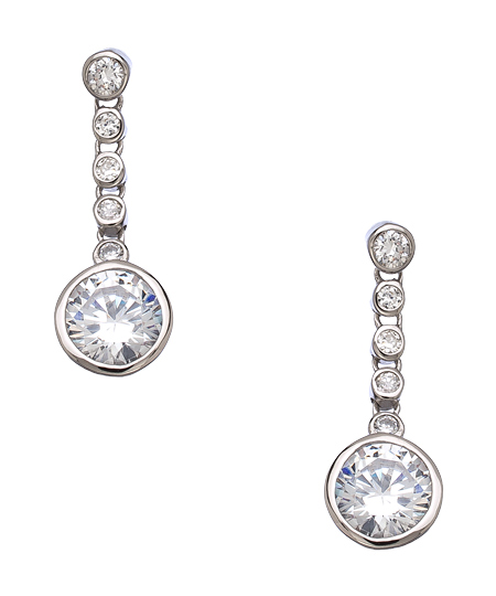 Sparkle and glam! Those are the ingredients used to create these stunning Tang and Song sterling silver dangling diamond drop earrings. Five sparkling cz stones create a path to the large, bezel set cz that dangles to catch the light. These earrings reflect the light magnificently - just as they reflect your extremely good taste! Earrings have a post closure for pierced ears.