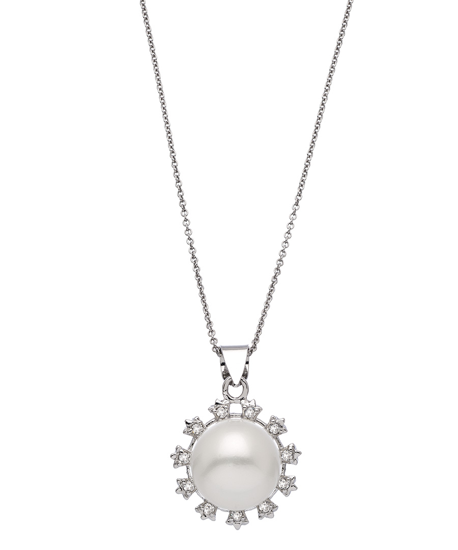 A beautiful, sparkling halo graces a large, gleaming pearl, in Tang & Song’s sterling silver, pearl and crystal sunburst pendant necklace. The large, smooth pearl is showcased to perfection by the sparkling ring of crystal accents. Necklace fastens with a spring clasp closure.