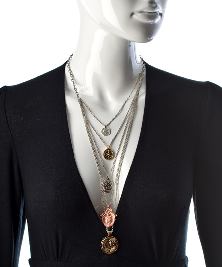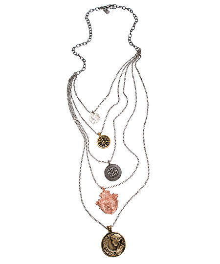 Hitting the trends for bib necklaces and vintage inspired jewelry, this five tiered angel charms and coin bib necklace is simply stunning. Gold and silver coins and charms are enhanced by a rose gold coin medallion and anchored by layers of vintage silver chain. The look is rich and luxurious - decidedly you! Necklace has a spring clasp closure.