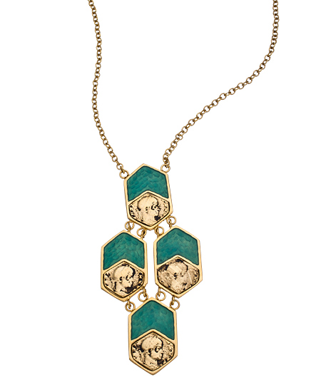 Perfect for casual attire, elegant enough for your fanciest outfit, this Tat2 Designs vintage gold and green enamel necklace is artisan crafted and exquisitely beautiful. Four hexagons are artfully arranged and embellished with textured green enamel chevrons and vintage gold coins. Necklace has a lobster clasp closure.