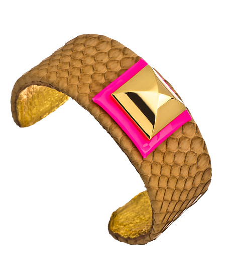 The Ted Rossi pink khaki pyramid python cuff electrifies even your most serious ensemble. The hint of neon pink is super funky yet the thick gold pyramid adds a hint of glamor. Toss it on to totally transform anything you are wearing. The earthy colored leather will always blend your uninhibited look.