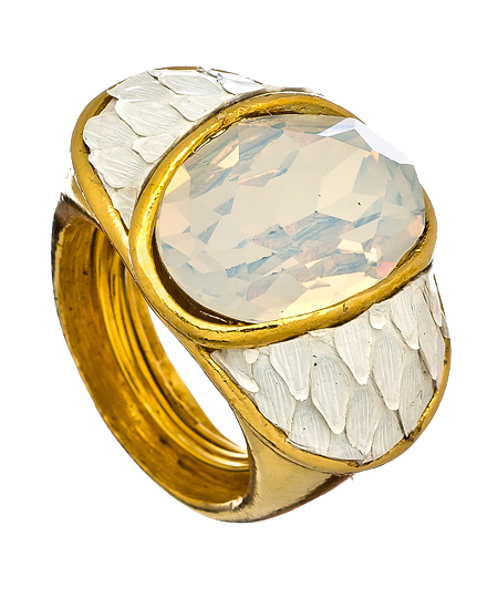 The Ted Rossi white gem python dome ring delivers on sensational style. It features a sparkling white crystal in an oval dome design, embedded in white python leather. This gold-tone ring offers a fabulous look with a chic appeal. Wear this Ted Rossi gem dome ring with shimmering new earrings.