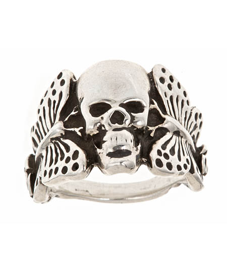 The Tina Tang butterfly skull ring has a bold yet ethereal quality. The haunting skull in the center of the chunky ring is flanked by two large butterflies. This effortlessly cool piece is handcrafted of oxidized sterling silver.