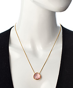 Tresor's gold and rose quartz trillion Fin necklace brings an interesting shape to a decidedly feminine look. The faceted, rose quartz trillion is bezel set in gold and joins the two sides of the gold chain. Necklace fastens with a lobster claw clasp.