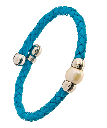 This turquoise woven leather bracelet with a freshwater pearl is exactly as its name suggests. Expertly crafted, turquoise leather has been woven to meet with two sterling silver balls on either side of a freshwater pearl. Simple, yet refined and totally styling.