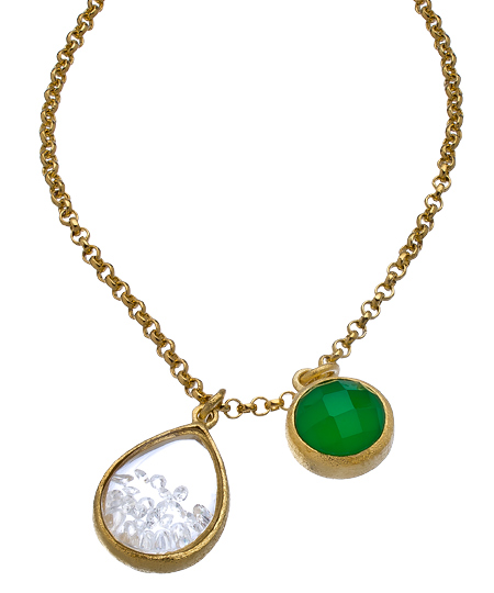 Classic green jade gets a contemporary makeover in this lovely green onyx jade CZ stardust charm necklace from Urban Posh. A faceted round-cut green onyx jade is complimented by a charm with loose cubic zirconias tossed inside. The gemstone necklace is perfect for everyday accessorizing.