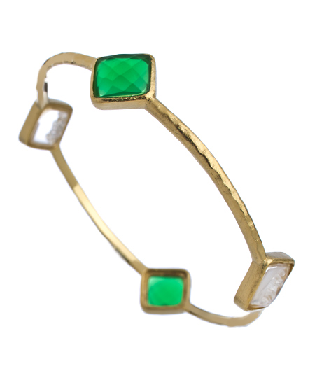 This elegant green onyx jade stardust four stone bangle from Urban Posh lends subtle style to your jewelry collection. The gold hammered bangle is dotted with two gleaming green onyx jade stones alternating in between clear stones with loose cubic zirconias tossed inside. The unique look of the shimmering CZ's provide just the right amount of sparkle.