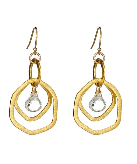 Go for the glitz with Urban Posh Lilly white topaz gold earrings. A faceted white topaz of exceptional clarity twinkles within two hammered wheels of 18K gold vermeil. The textured gold finish and asymmetrical shapes elevate the already opulent look to one of pure privilege.
