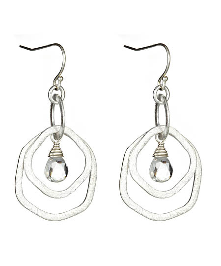 Let your light shine with the Urban Posh Lilly white topaz silver earrings. These shimmering beauties feature a solid faceted white topaz suspended from two hammered sterling silver wheels. The organic, asymmetrical rounds provide an interesting counterpoint to the geometric-cut stones, as light bounces back and forth between them.
