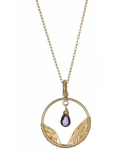 The Urban Posh Petite Kailey iolite and gold necklace has a romantic form but a modern soul. A whisper-light gold fill chain suspends a tiny purple iolite inside a slender golden orb. But the orb is wrapped in fine gold wires, giving a slightly industrial edge to the delicate piece. This is one tiny but mighty example of dramatic impact!