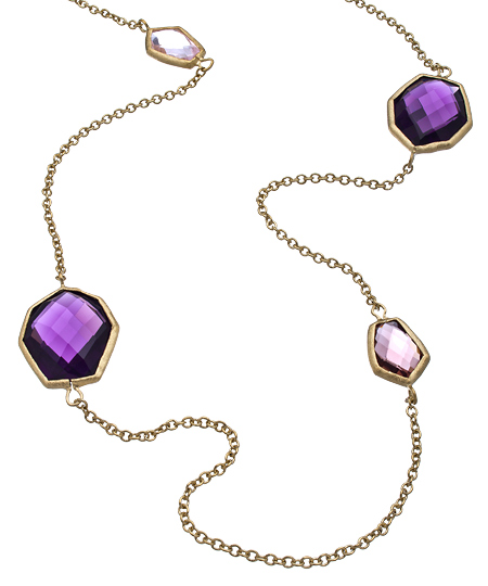 Add to your sophisticated presence as you slip on this glamorous purple ombre quartz septagon station necklace from Urban Posh.