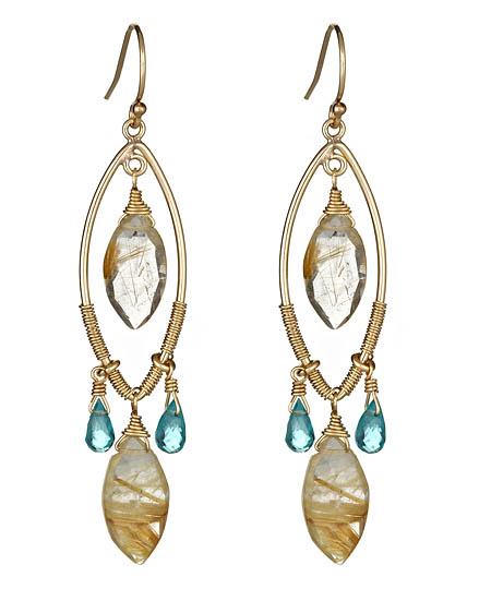 The Urban Posh Taryn earrings feature large gems of rhutile quartz, smartly cut and striated with golden bands, and strung from gold fill diamond-shaped frames. Apatite accents provide an unexpected pop of surf-like color, for a fresh, modern feel that's in keeping with today's casual elegance.