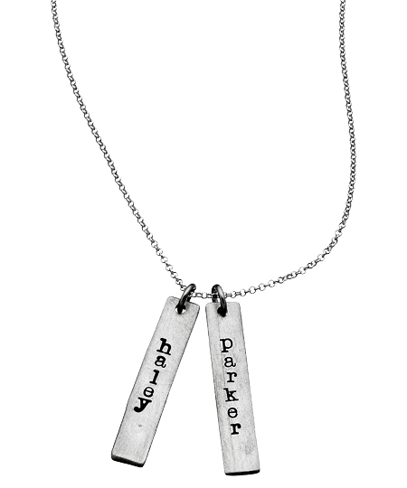 For a thinner sleeker look try the mod mommy double name bar necklace from Urban Sweetpea. Each bar can be engraved with a maximum of 10 characters. This necklace fastens with a spring ring closure. Please indicate in the notes section at check out the two separate names.