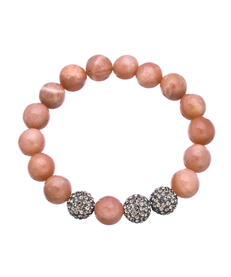 This bright peach moonstone bracelet from Very Me looks cheerful and sweet with a single strand of peach moonstone beads. Three silver crystal balls are stationed near the center for an amazing contrast of color. The bracelet is perfect for stacking or wearing as a solo statement accessory.