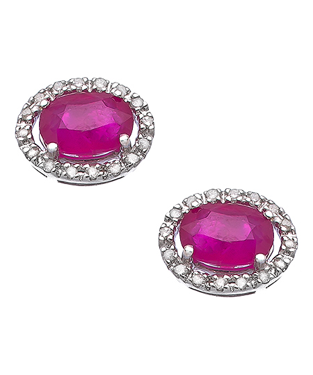 These Viducci white gold, ruby and diamond earrings are simply stunning. Piercing red, oval rubies are faceted and prong set in a circle of sparkling pave diamonds. The effect is one of elegance and refinement. Earrings have a post closure for pierced ears.