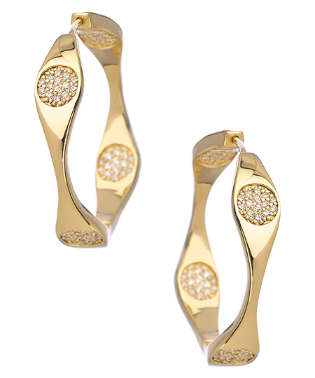 Vivian Jacob presents these gold and CZ wide hoop earrings, as perfect for everyday as they are for evening wear. The hoops’ shape varies from thin to thick, with two of the stations home to round fields of glimmering CZ stones. Earrings fasten with a continuous hoop closure for pierced ears.